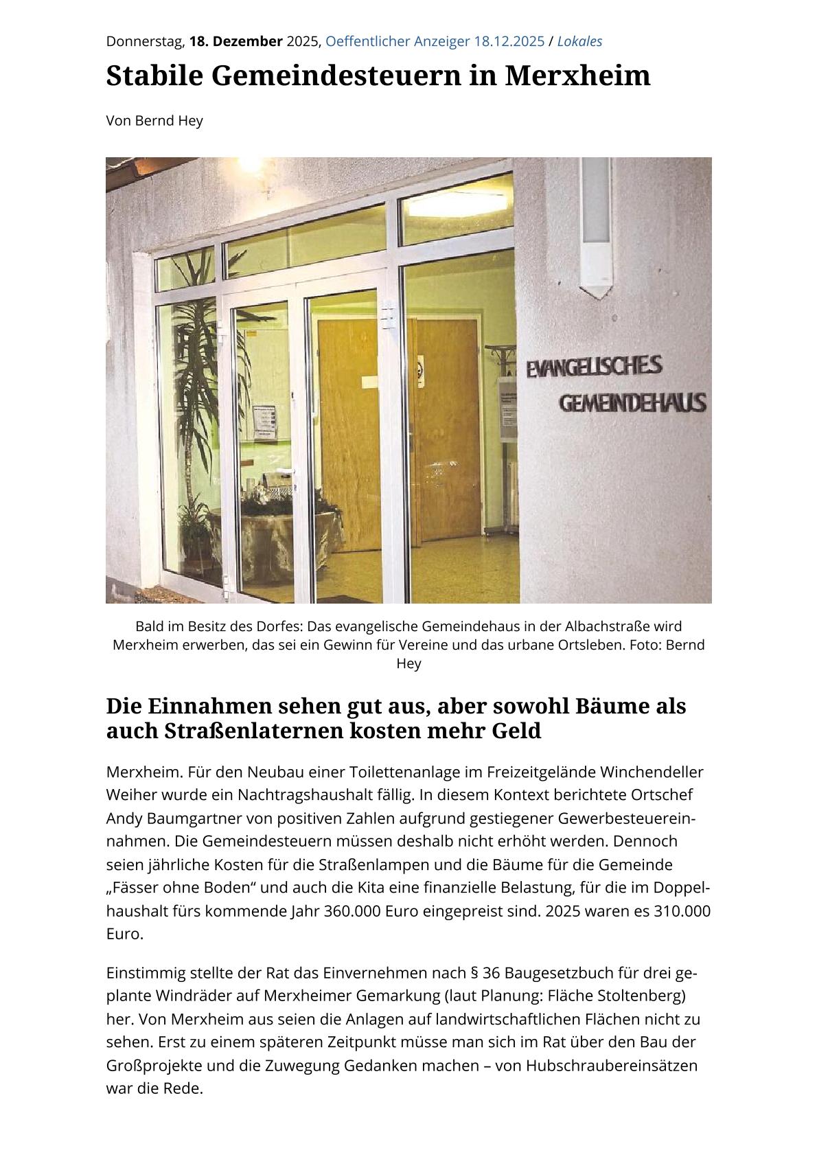 Zeitungsbericht zur Gemeinderatssitzung vom 15.12.2025Zeitungsbericht von Bernd Hey im Öffentlichen Anzeiger zur Gemeinderatssitzung vom 15.12.2025 als PDF (klick)Bernd Gutheil2025-12-17T20:55:08+01:0017. Dezember , 2025|Merxheim aktuell, Ortsgemeinderat, Pressemitteilungen|